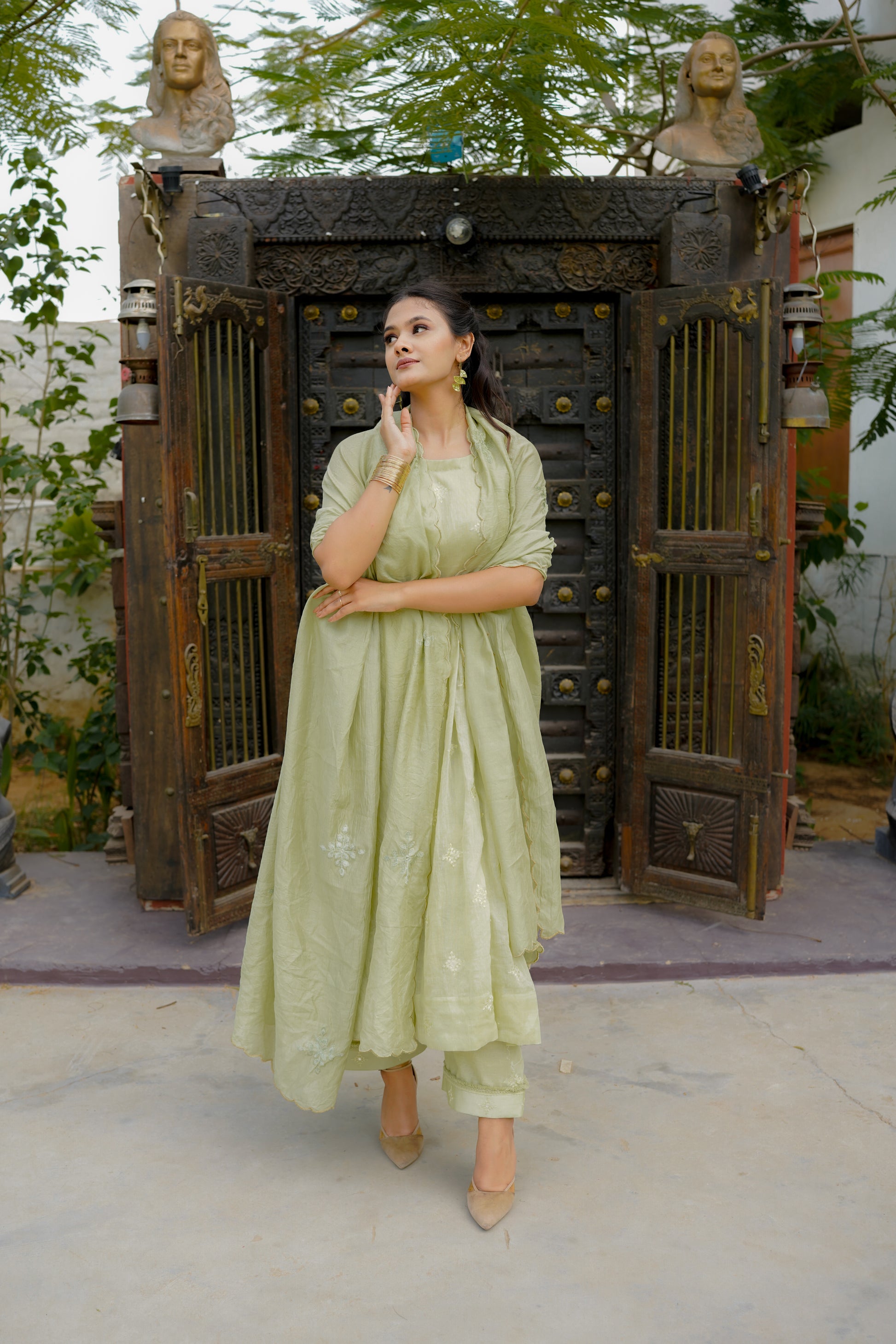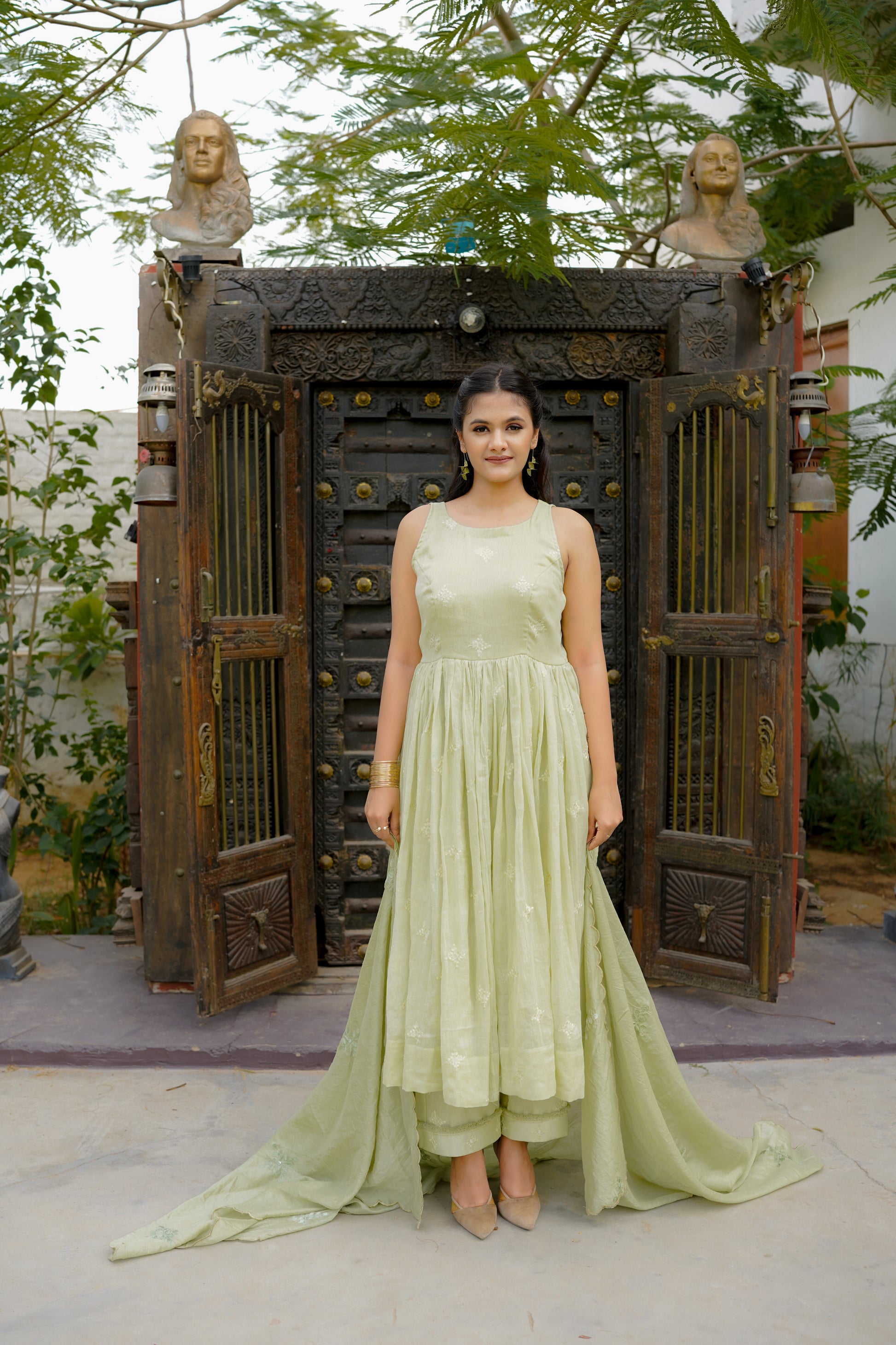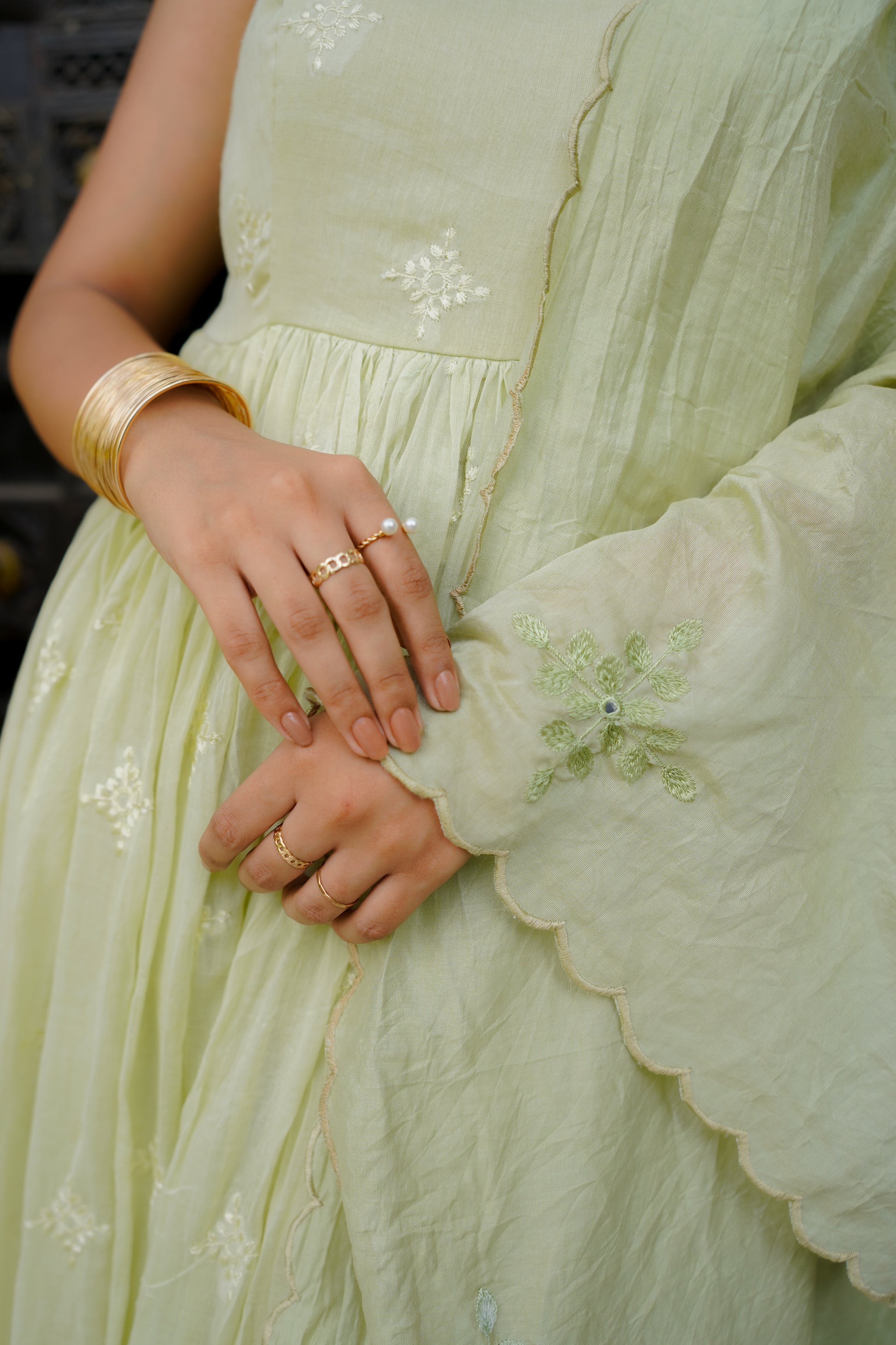 The Dahlia Anarkali Set in Elaichi fits perfectly. The color is soft and lovely.