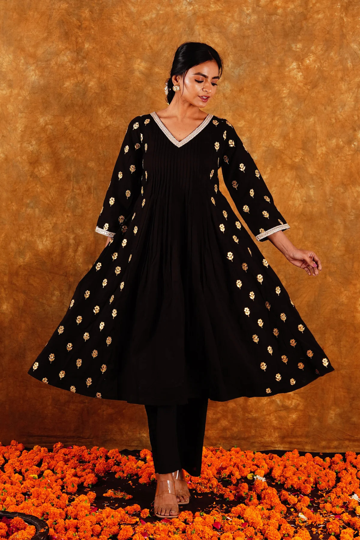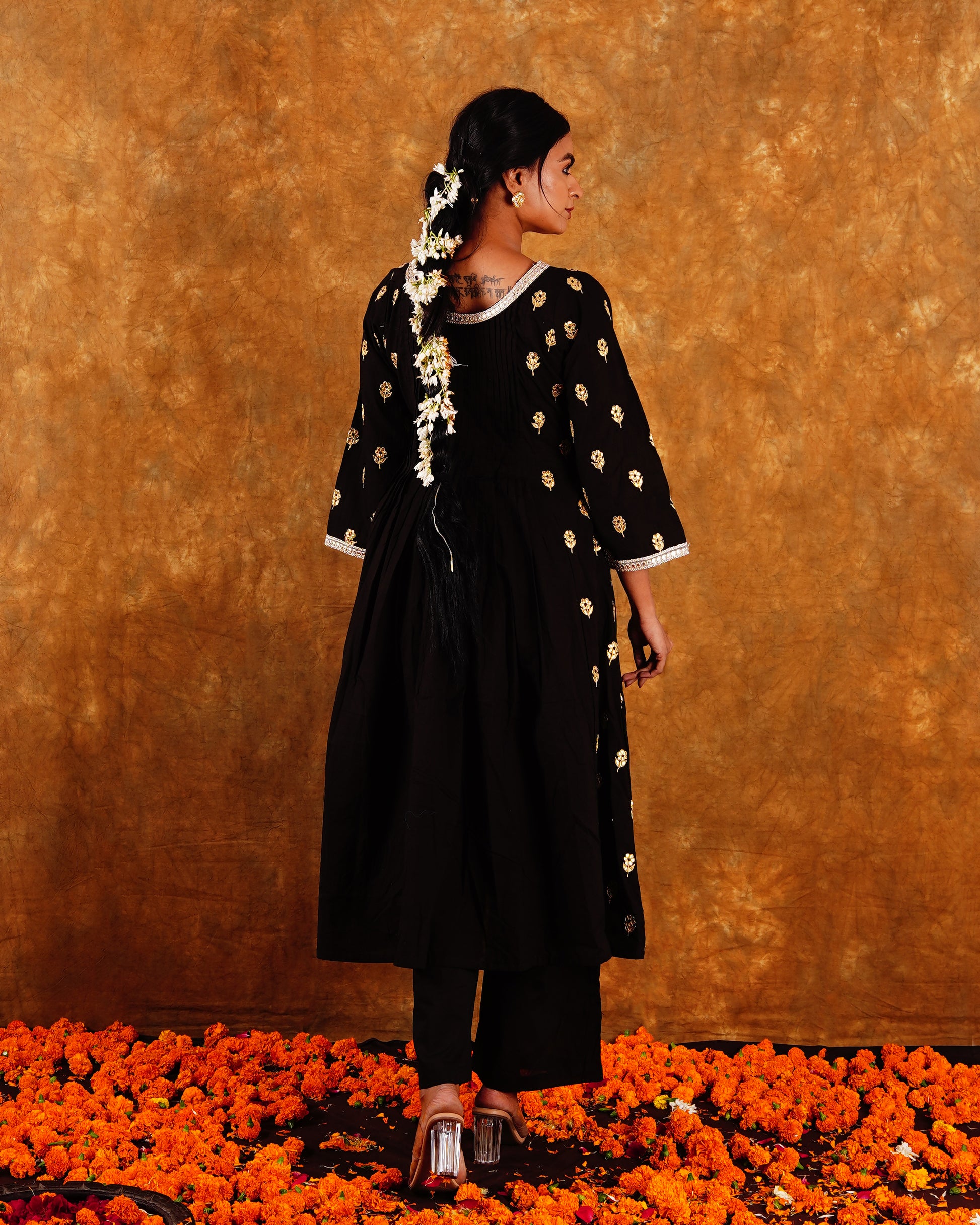 Radiate elegance with the Chamkeeli's Kurti Set, a meticulously designed outfit that brings together timeless tradition and contemporary charm. Showcasing a gracefully flared kurti with intricate detailing on the hemline and sleeves, this ensemble is perfect for making a statement at festive events and celebrations. The thoughtfully coordinated bottoms complete the look, ensuring a seamless and polished appearance.