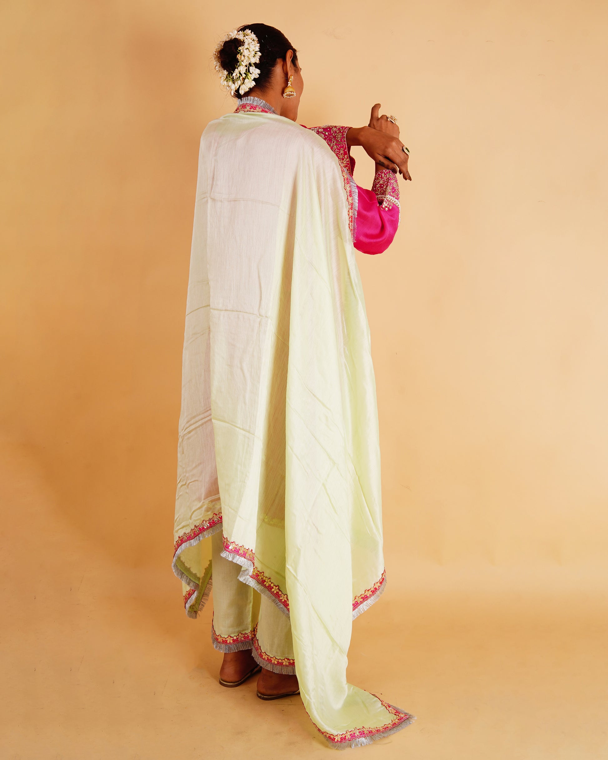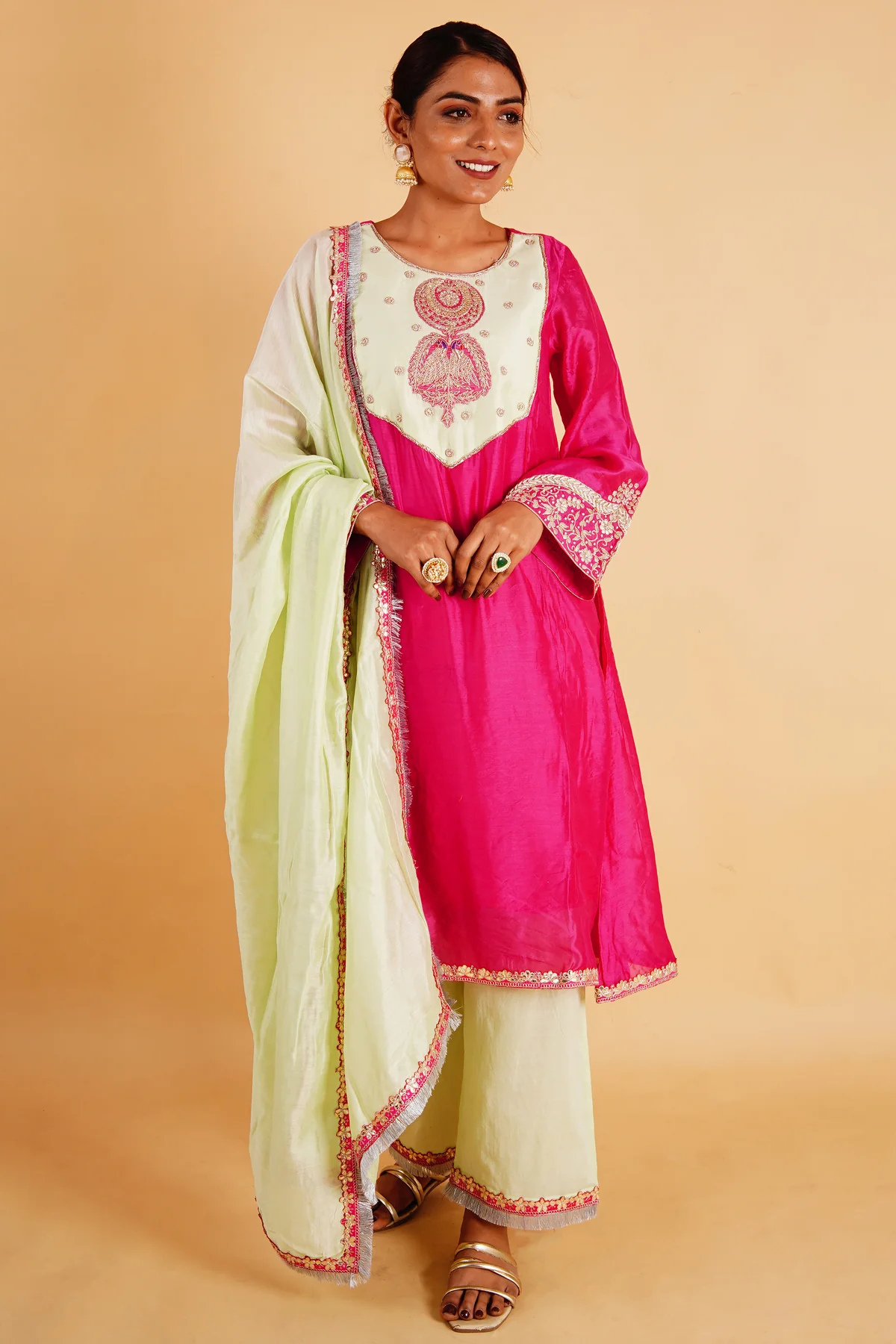 Embrace timeless beauty with the Lajjo Kurti Set, a harmonious blend of elegance and tradition. This set features a beautifully embroidered kurti paired with complementing bottoms and an intricately designed dupatta, creating a complete ensemble perfect for festive occasions and celebrations. The exquisite detailing on the neckline, sleeves, and borders adds a refined charm, making this outfit a standout choice for every event.
