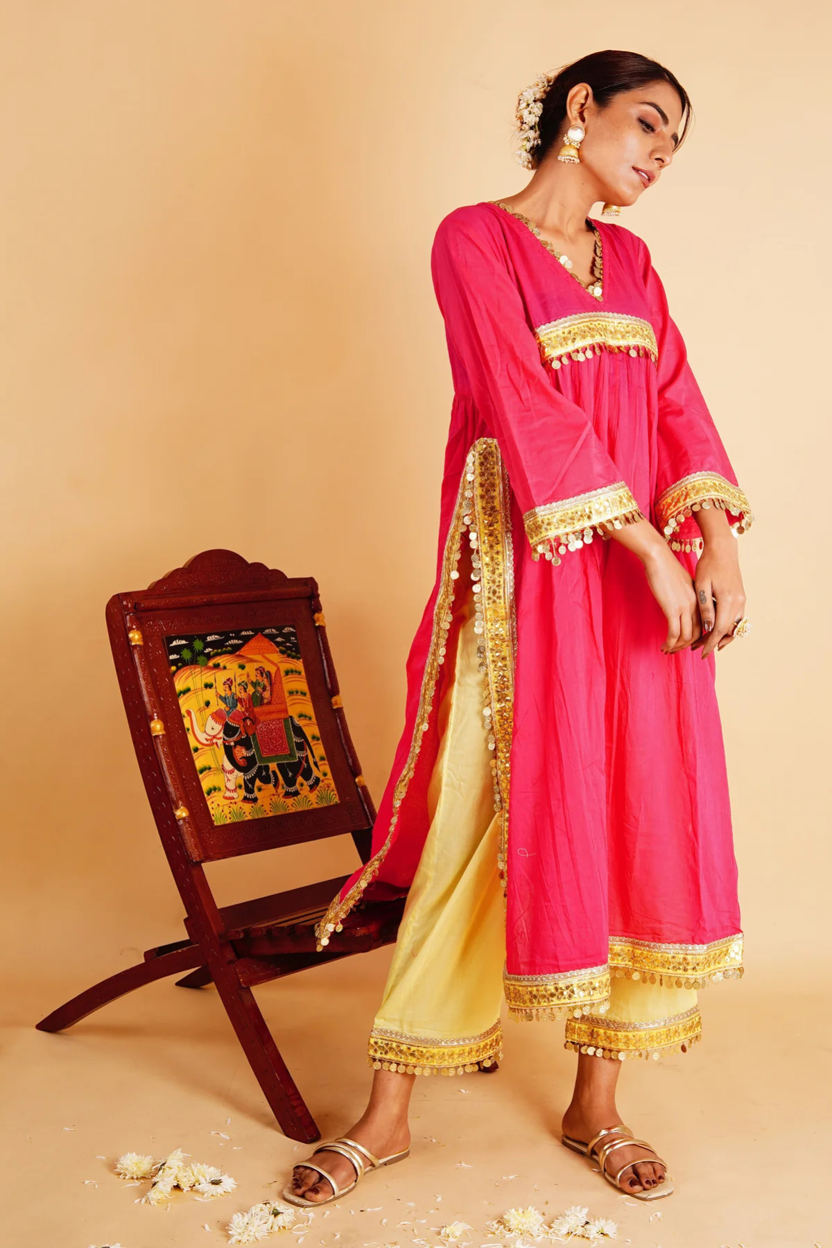 The Rangoli Gulzar Kurta Set in Pink is comfortable and elegant. Perfect for casual or semi-formal days.