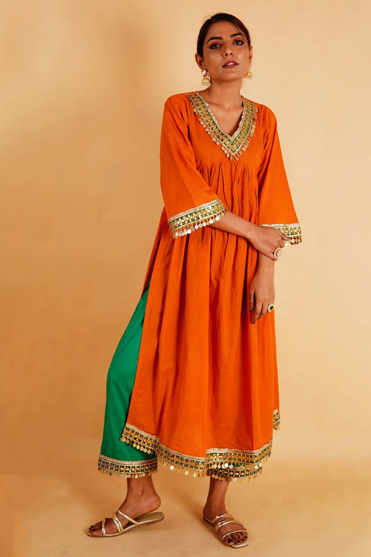 Step into grace with the Rangoli Noor Flared Kurti Set, an ensemble designed to celebrate your unique style and elegance on every special occasion