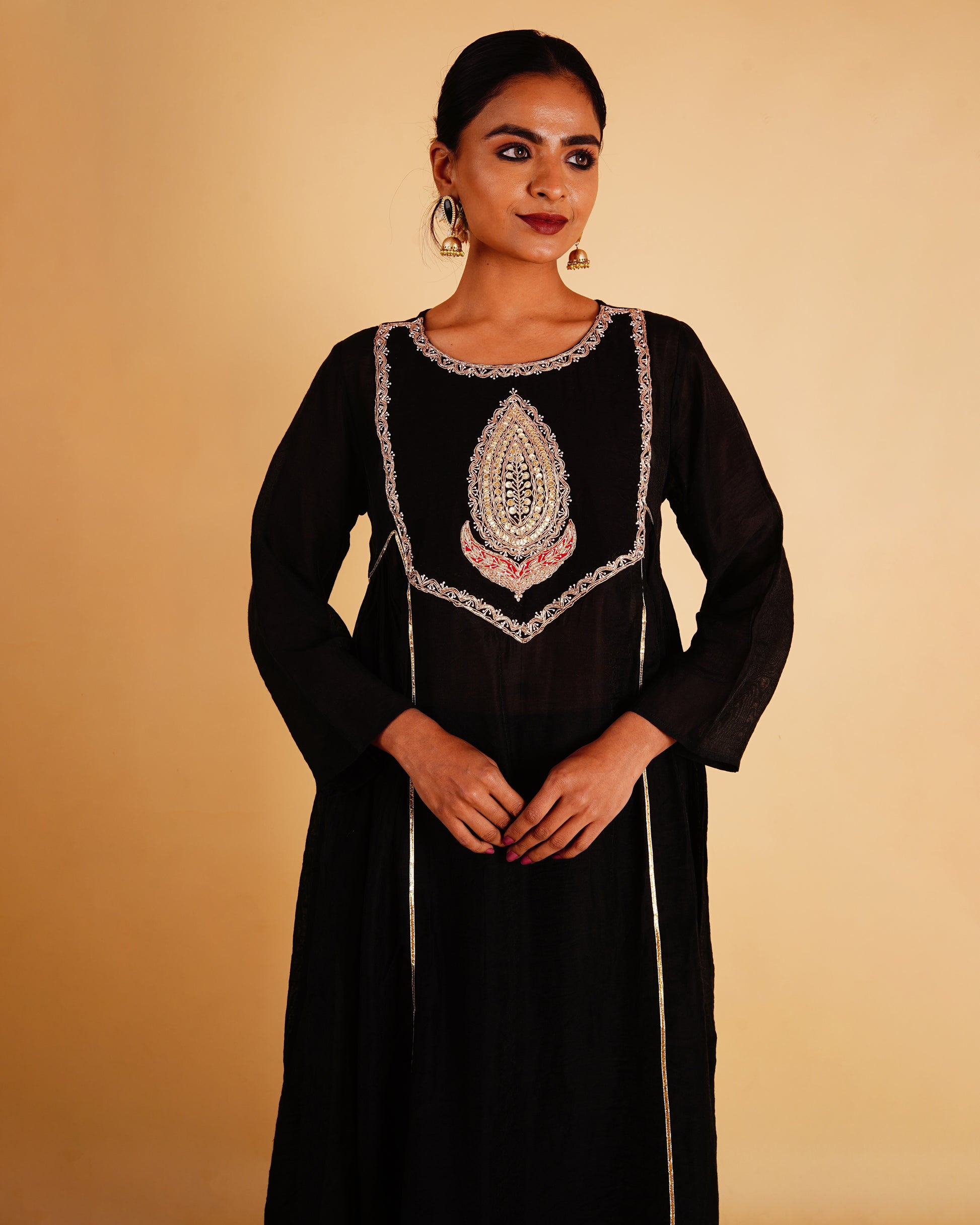 Made from lightweight and breathable fabric, the Tilak Kurti Set ensures unmatched comfort, making it ideal for long events. Its regal black hue, paired with exquisite embroidery, allows you to style it with bold jewelry or understated accessories for a look that resonates with your unique style.