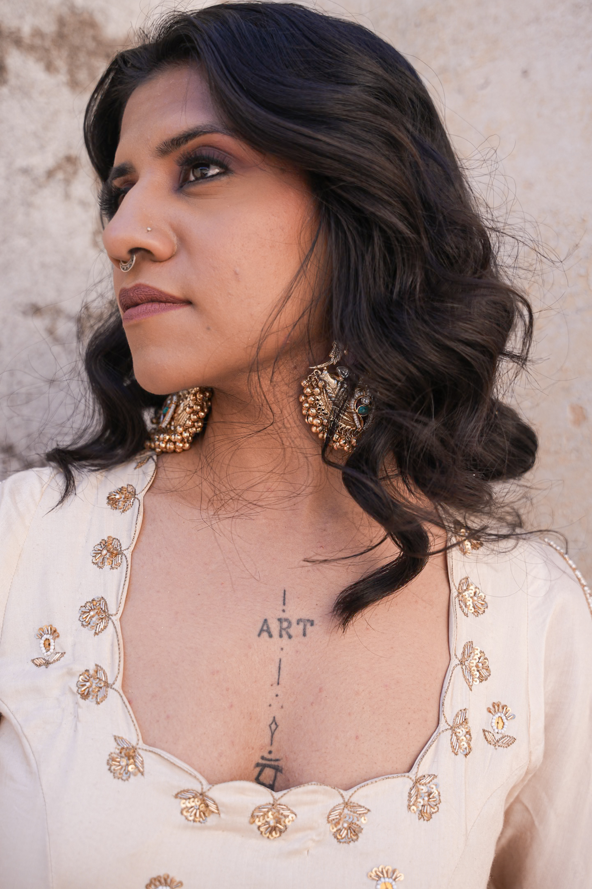 The Radha Anarkali is a true masterpiece, crafted from luxurious crepe fabric and adorned with intricate hand embroidery. Featuring exquisite metal sequins, beads, and zari work, it showcases a scalloped-edge neckline for a refined touch. The statement boota on the sleeve, inspired by heritage motifs from Rajasthani paintings, adds to its regal charm. The Anarkali is beautifully finished with delicate golden lace.