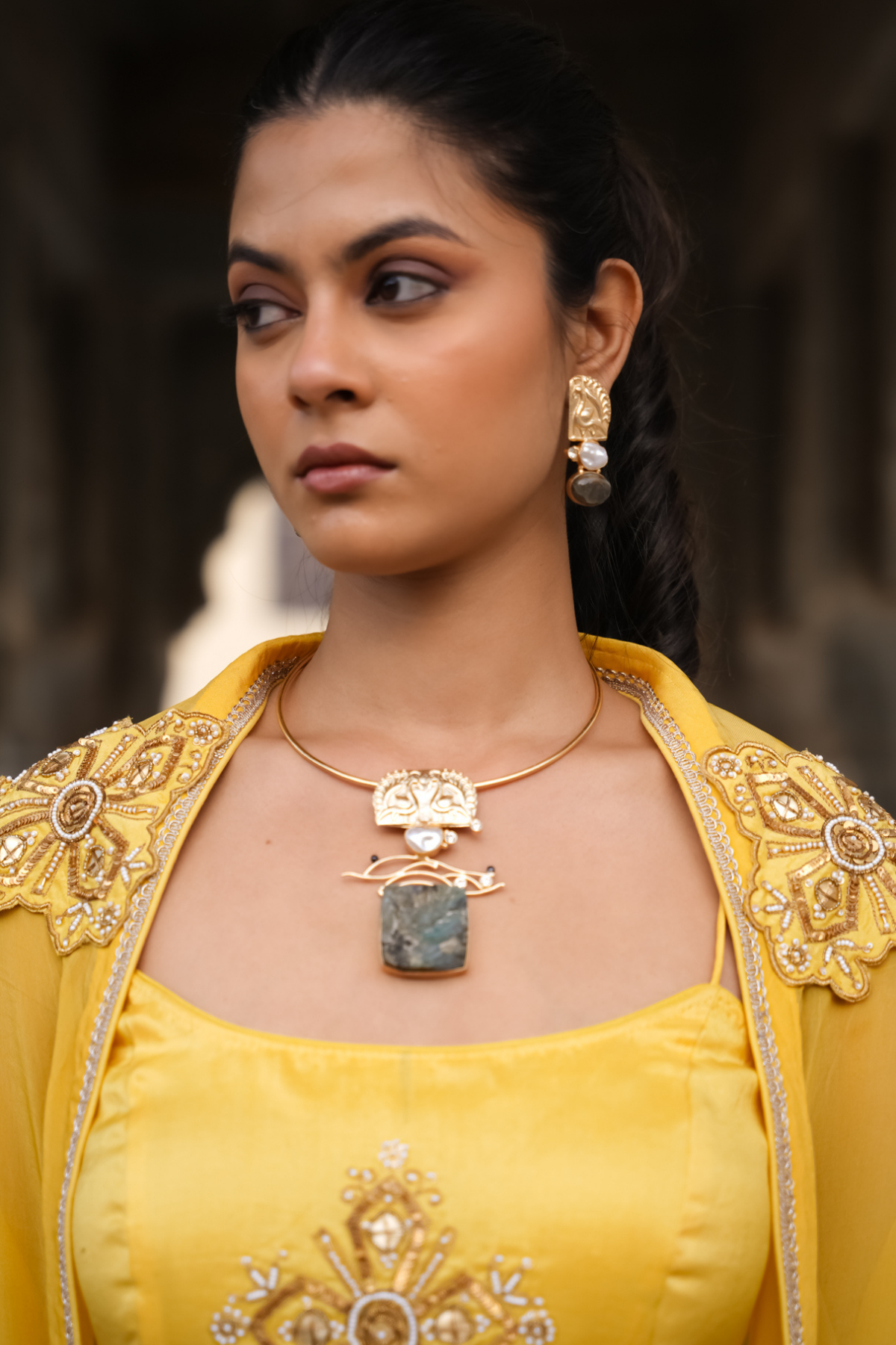 The Sakhi Drape Set is a stunning fusion of traditional and contemporary design, perfect for adding an elegant touch to any wardrobe. The drape, crafted from delicate organza fabric, features intricate patchwork hand embroidery inspired by the rich Rajasthani heritage art. The motif, adorned with shimmering metal sequins and beads, adds a layer of opulence and sophistication. The drape is beautifully finished with delicate lace, enhancing its grace and charm.