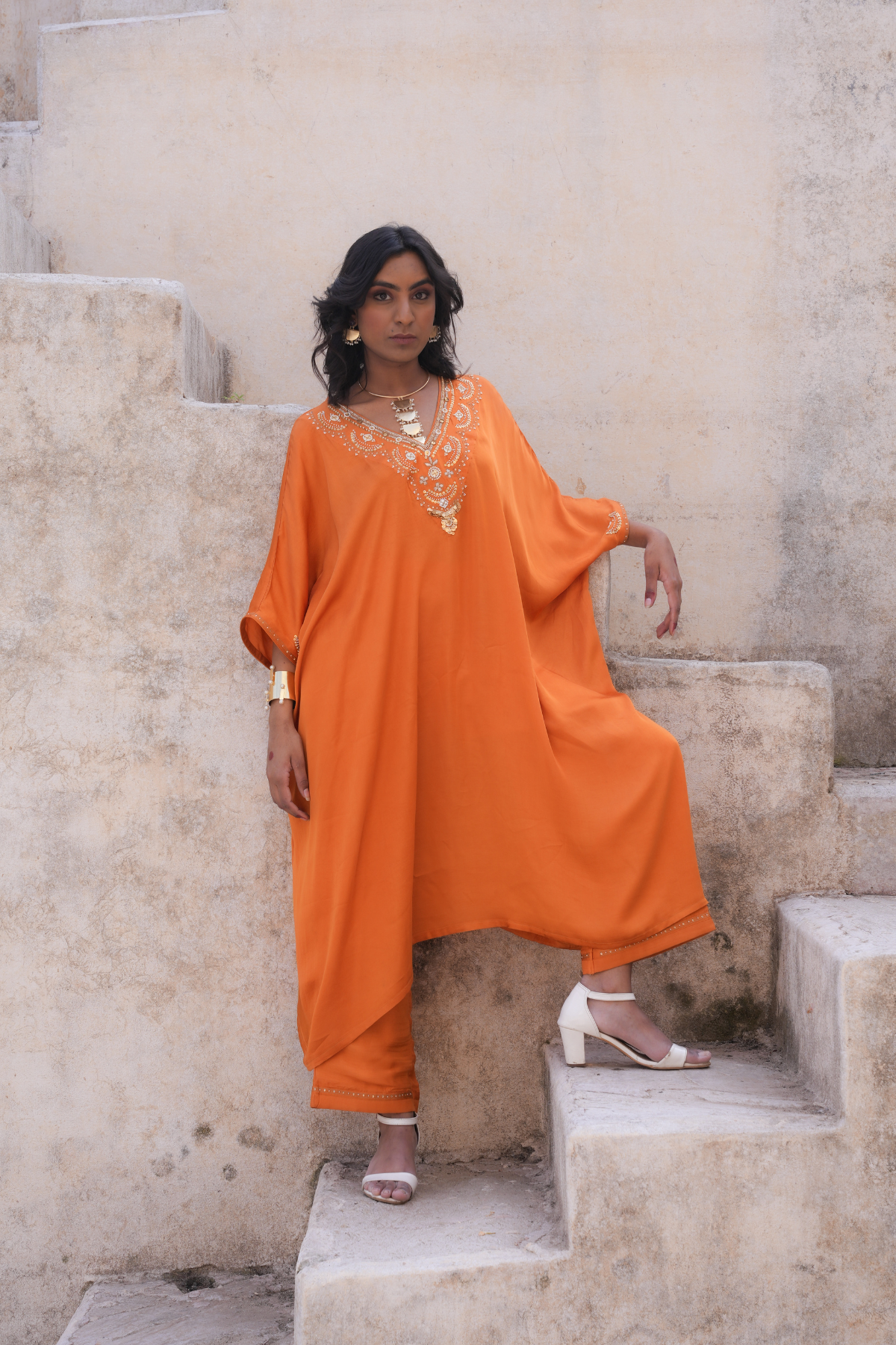 The Sakhi Kaftan Set is a thoughtfully designed ensemble that blends contemporary style with traditional craftsmanship. Made from flowy modal fabric, the v-neck kurta features exquisite hand embroidery, showcasing intricate mirror work, beads, and metal sequins. The embroidery adds a touch of elegance, creating a rich and sophisticated design.