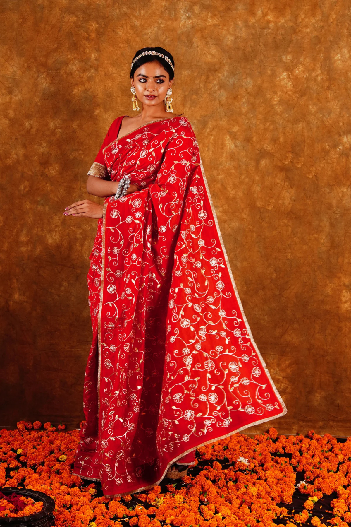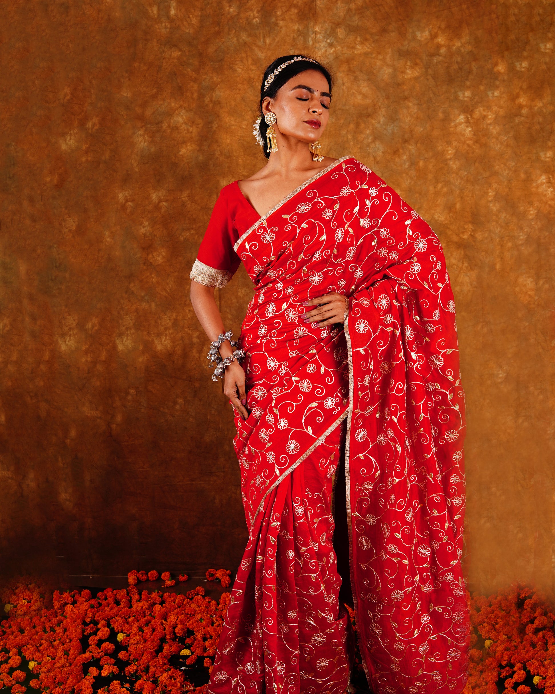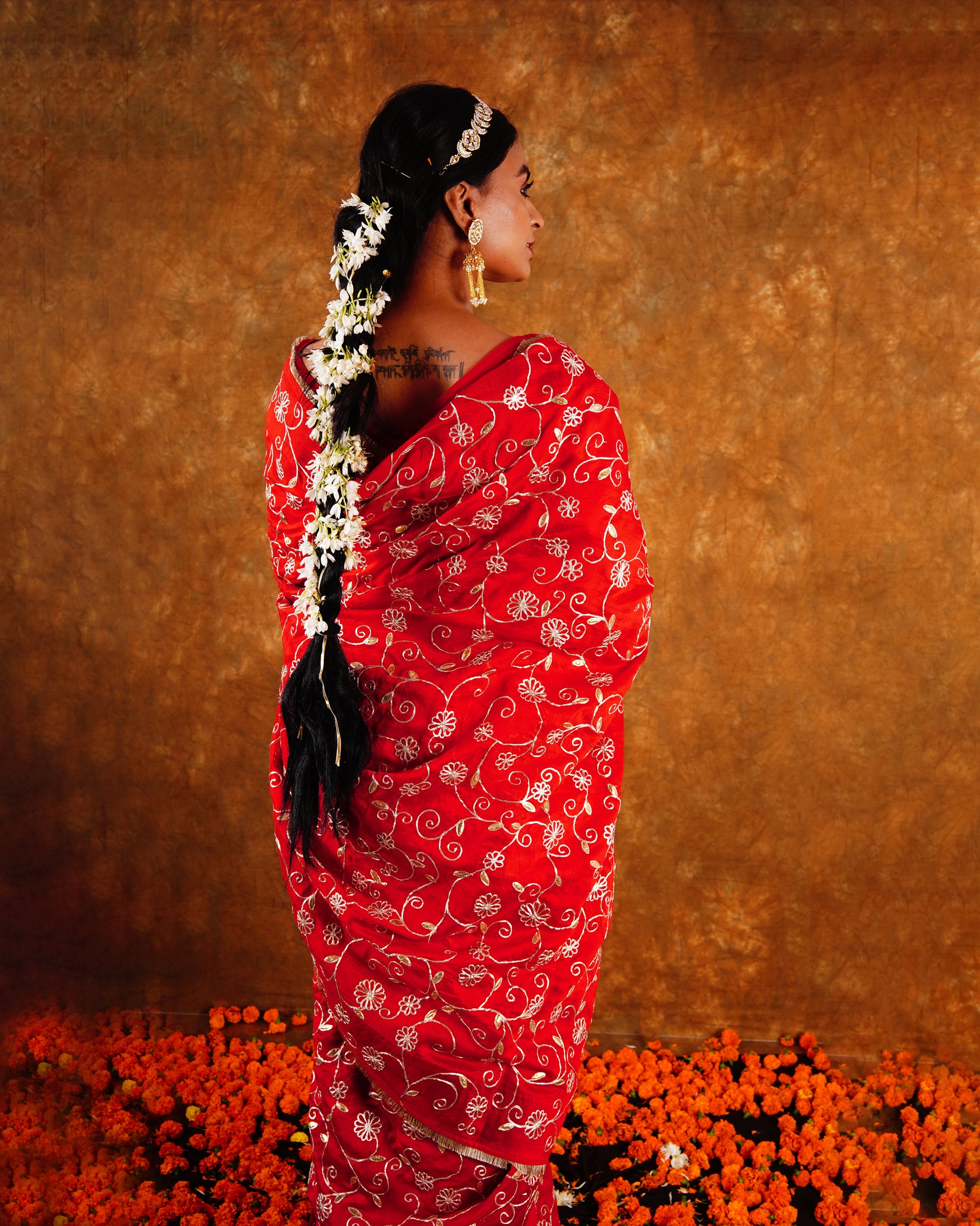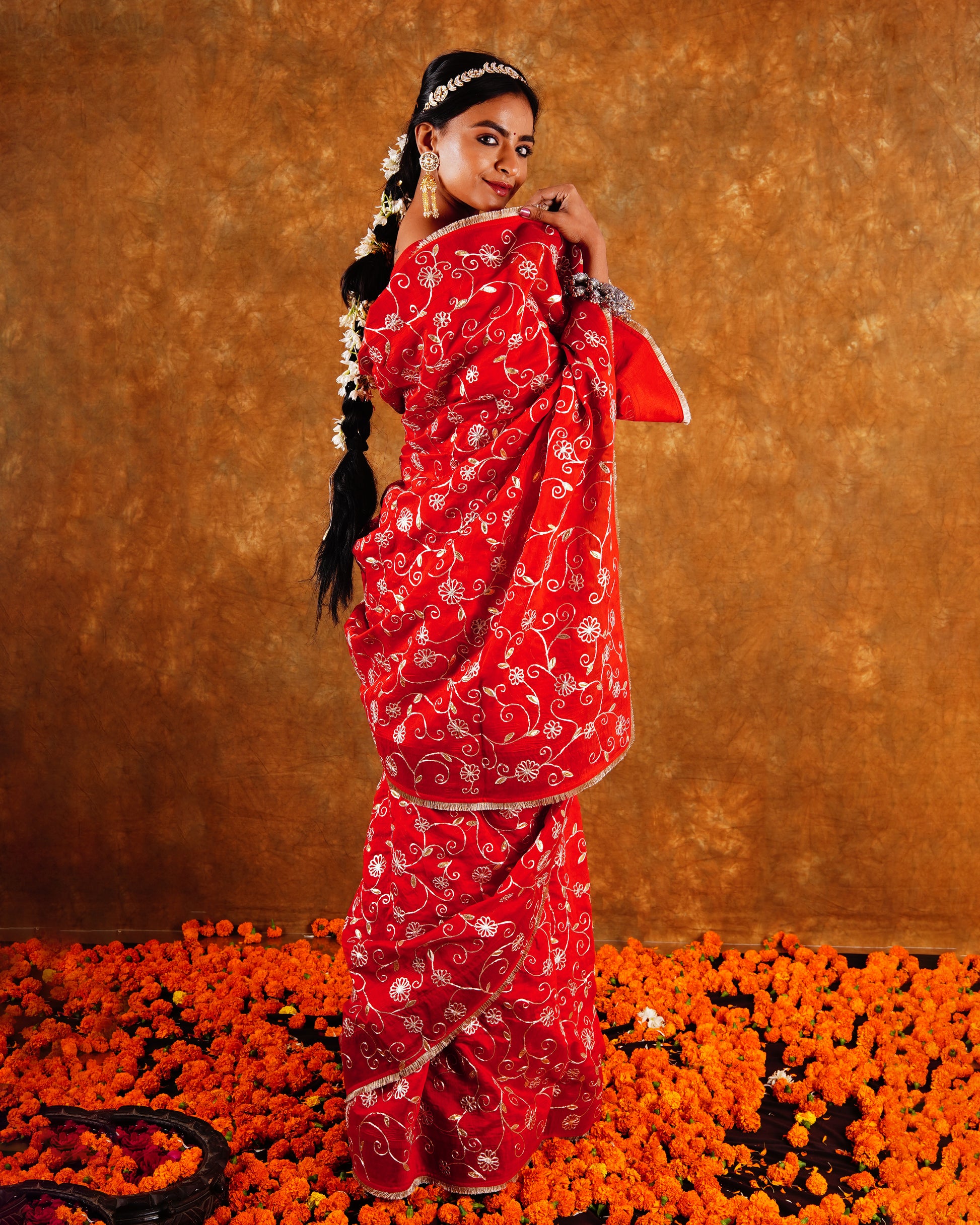Step into elegance with the Chandrika Heavy Jaal Saree, a masterpiece that redefines timeless beauty. Featuring intricate floral and vine-inspired embroidery, this saree captures the essence of grace and sophistication. The delicate silver border adds a luxurious touch, making it the perfect attire for celebrations and special occasions.