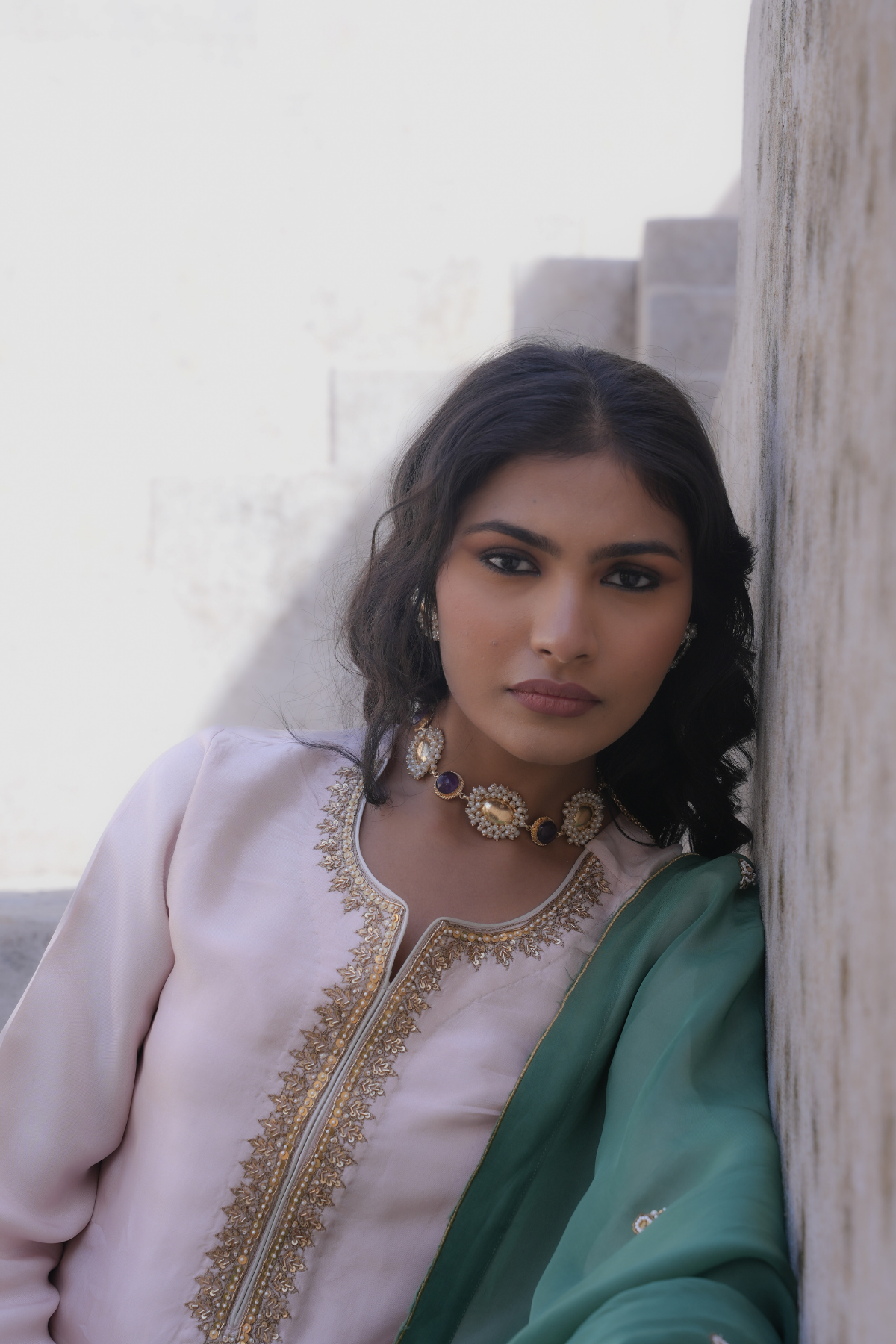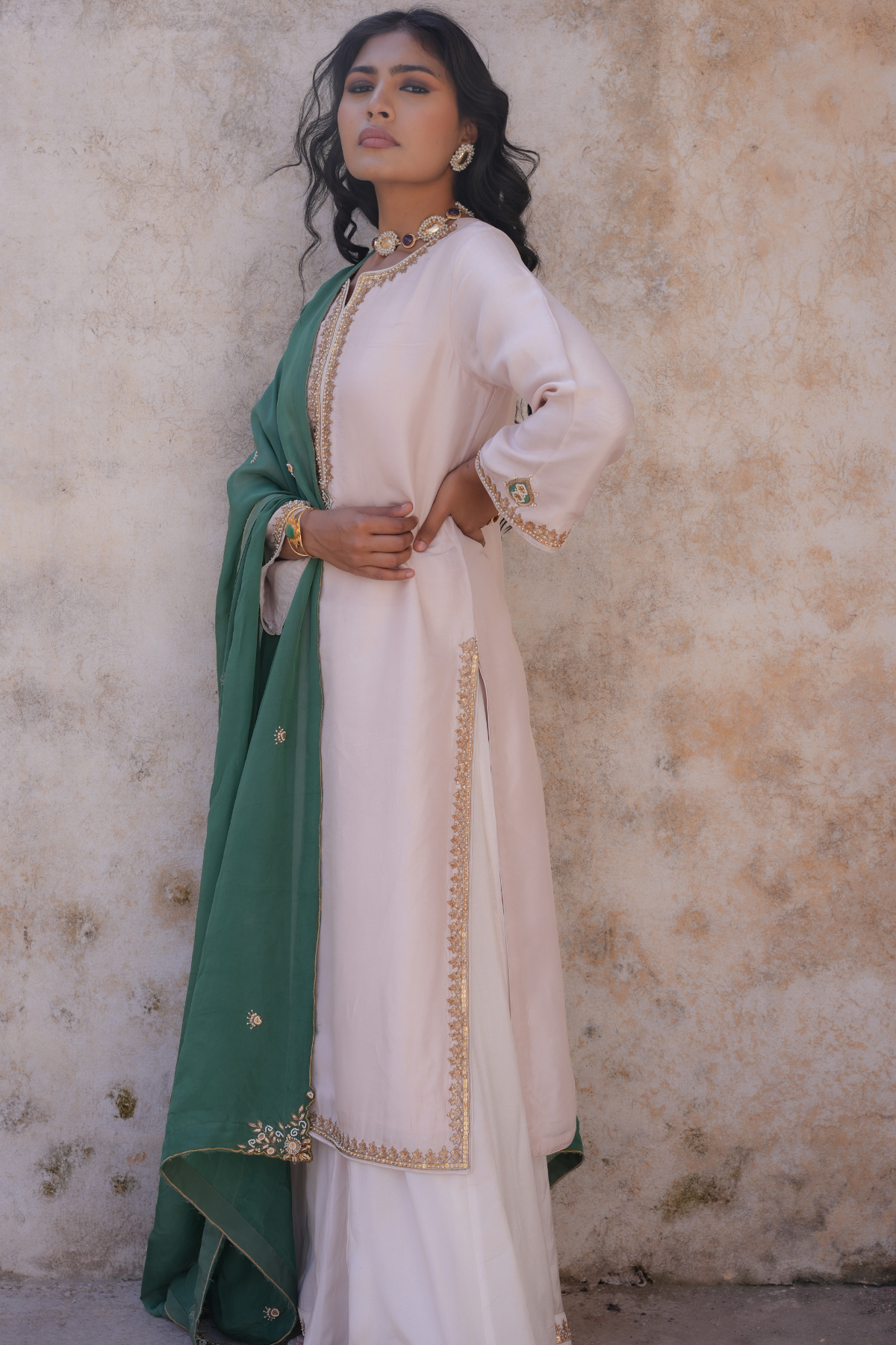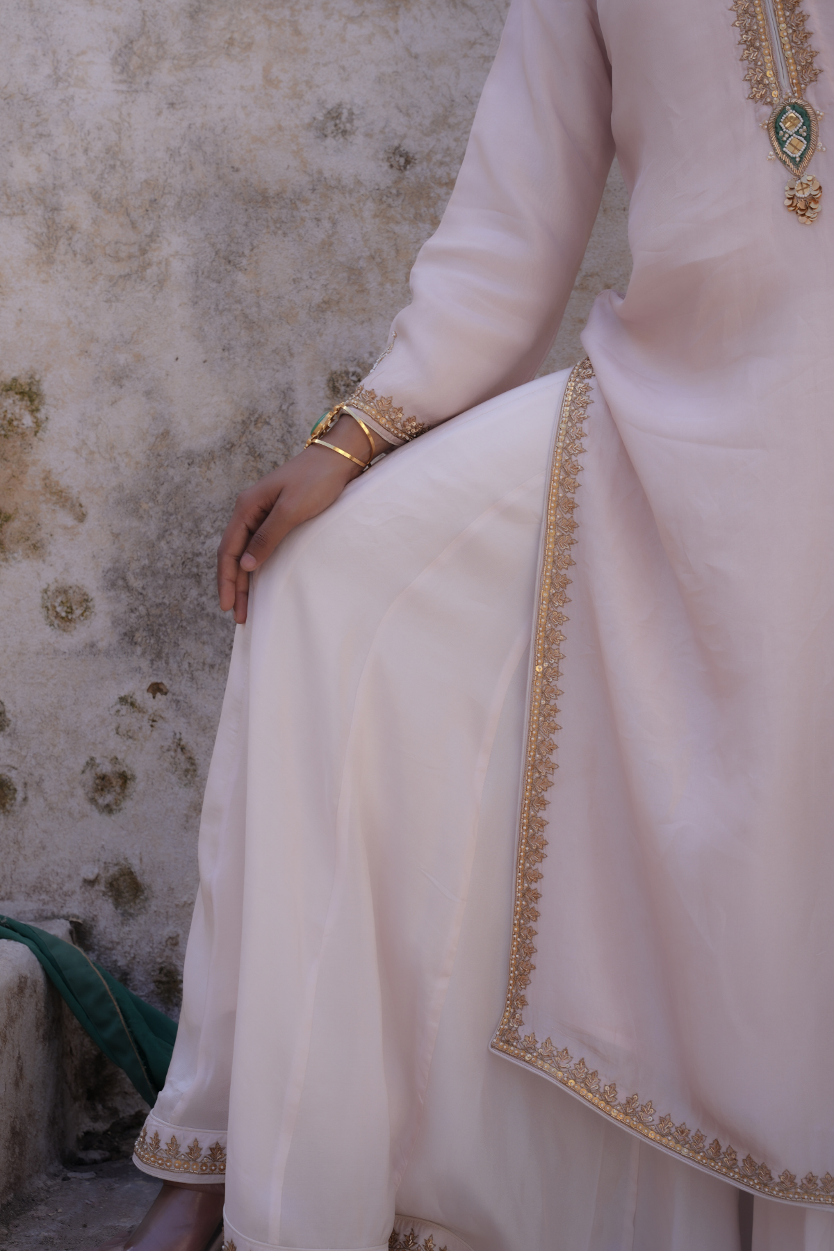 Paired with the kurta are modal pants, which perfectly complement the kurta's flowy silhouette. The pants are finished with intricate aari embroidery and beads, bringing an added level of detail and charm. This set captures the essence of grace and elegance, with a perfect balance of contemporary and traditional elements.