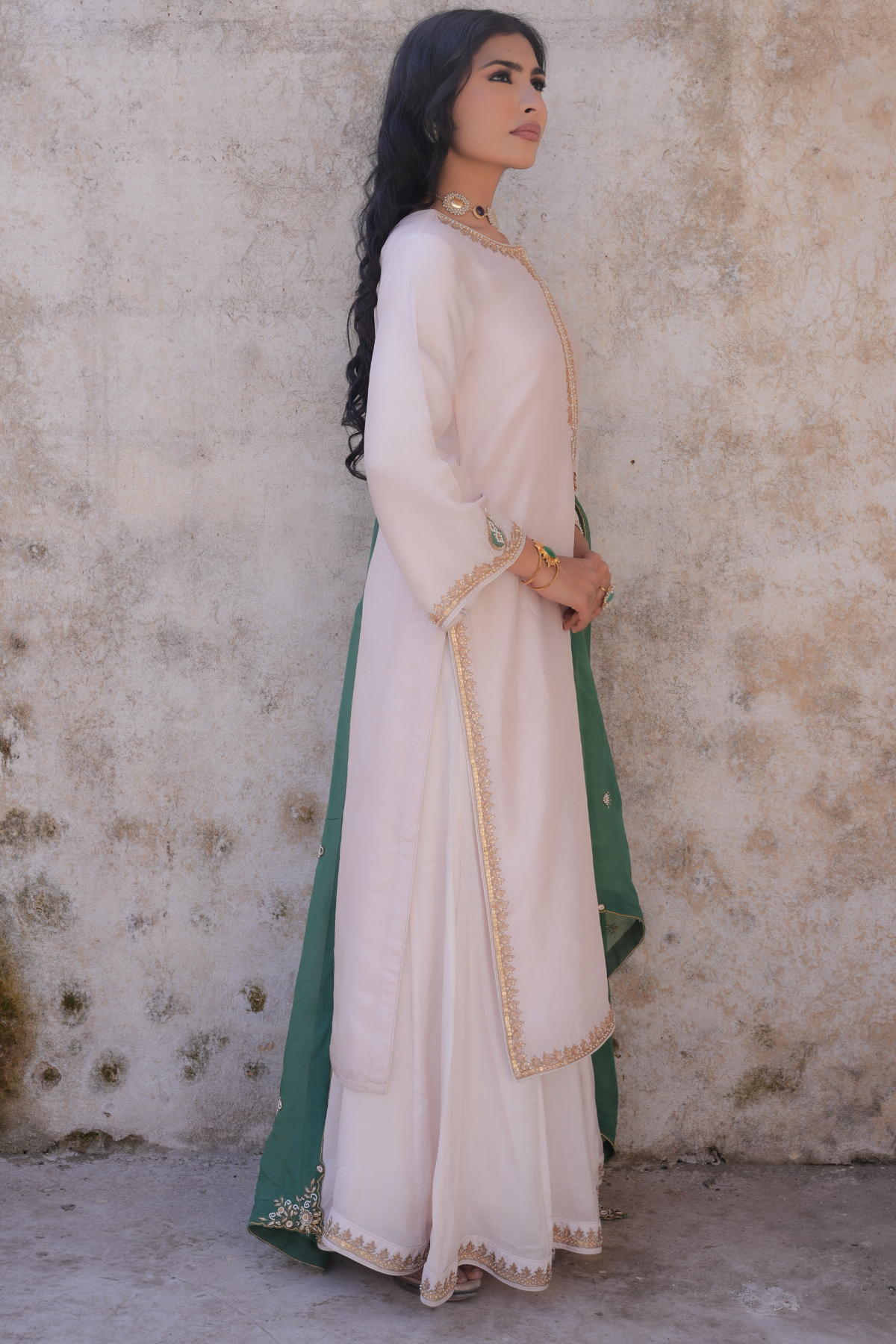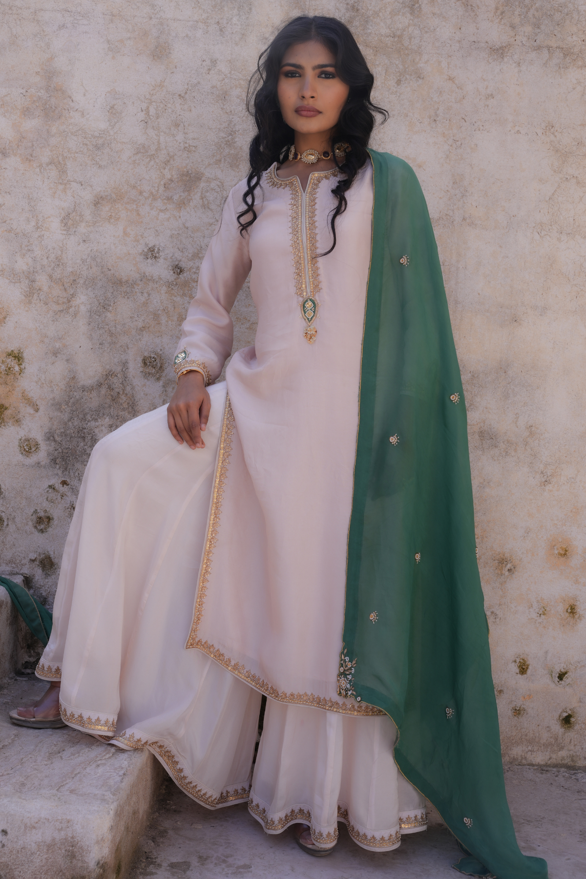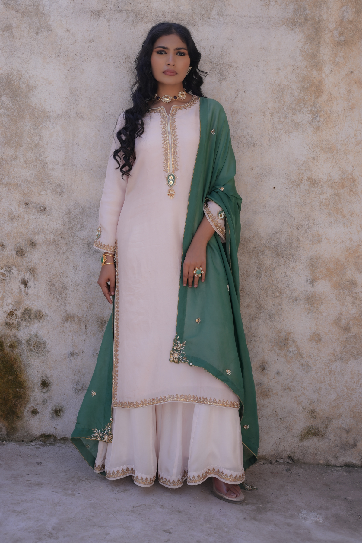 Paired with the kurta are modal pants, which perfectly complement the kurta's flowy silhouette. The pants are finished with intricate aari embroidery and beads, bringing an added level of detail and charm. This set captures the essence of grace and elegance, with a perfect balance of contemporary and traditional elements.